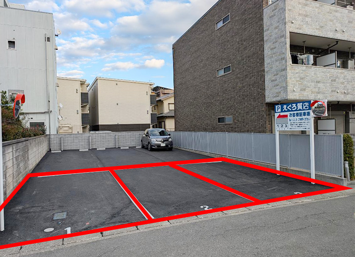 店舗とファミリーマートの間の道に入ると駐車場があります。